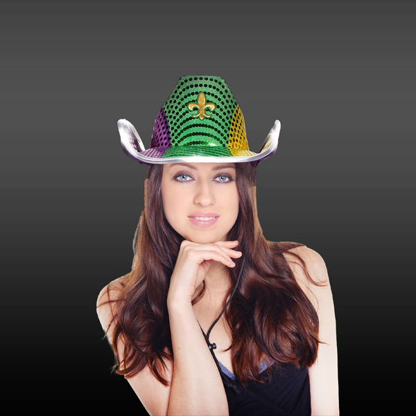 Purple cowboy hats are well suited to be used along with green and gold hats for Mardi Gras. Buy these purple cowboy hats or light up tri-colored Mardi Gras cowboy hats in bulk in order to get them for a discounted price instead of the regular price in the USA.