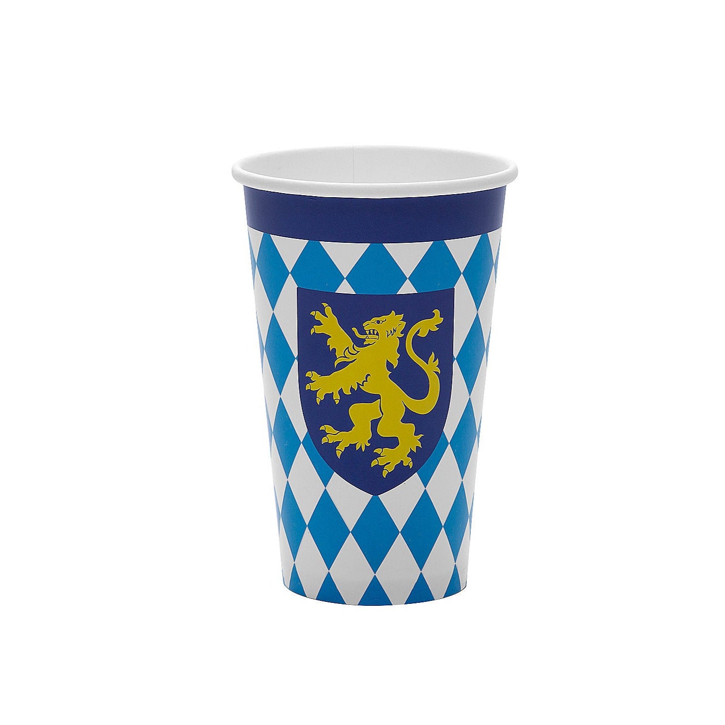 Raise your glass in style with these 16 Oz Oktoberfest Disposable Paper Cups, perfect for any Oktoberfest party or celebration. Featuring a festive design with a yellow lion crest on a blue shield over the classic white-and-blue diamond pattern, these cups add an authentic Bavarian touch to your drinks station, bar setup, or party table. Made from paper, they are convenient for serving beverages or party favors and ensure easy cleanup after the festivities.