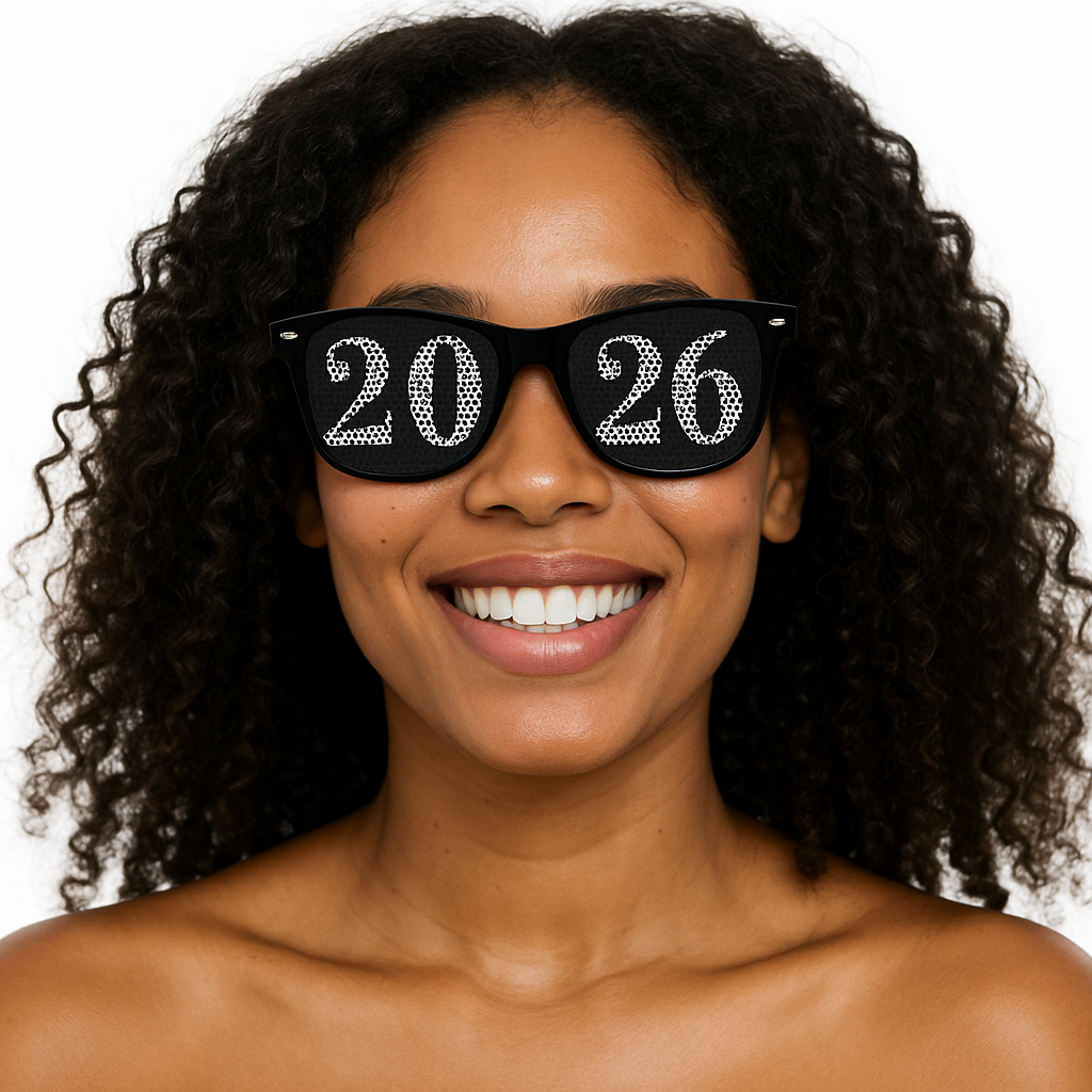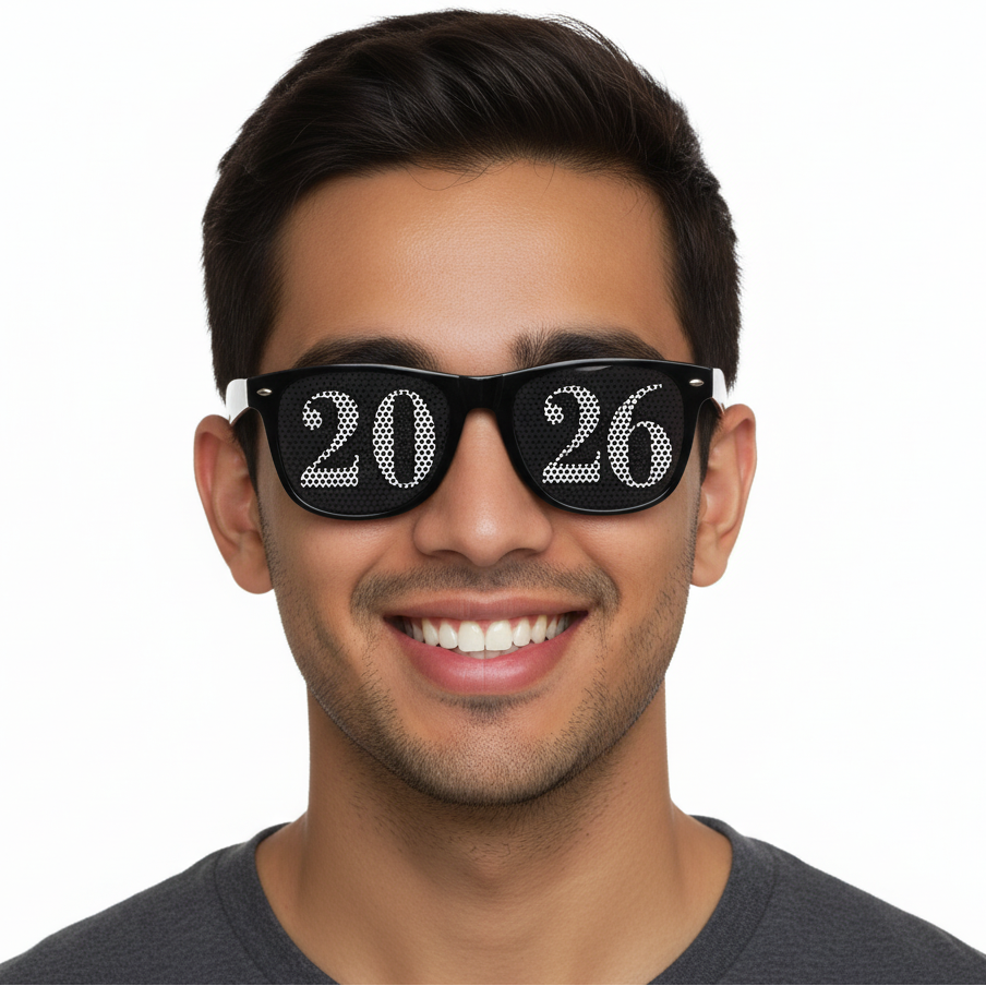 New Year's Eve is the perfect place to don your 2026 billboard-style eyeglasses. 2026 Sunglasses make the perfect handout at graduation parties, proms, and senior days, too. Each pair features unique pinhole decals that create a fun design across the lenses of our New Year's party glasses. Imprinting is available on the arms (please inquire about cost). One size fits most. Please do not drive or operate machinery while wearing. Sold by the individual pair of sunglasses.