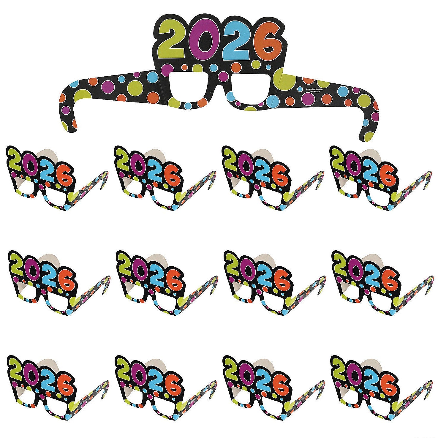 Head into the new year in style with these 2026 Polka Dot Cardstock Novelty Glasses! These bright-colored glasses feature green, purple, blue and orange colors with "2026" on the top. The novelty glasses are the perfect party favor to take a New Year's Eve celebration with friends and family to the next level. Wear these all night long or use them as photo booth props to create memories that will last forever! For novelty use only.