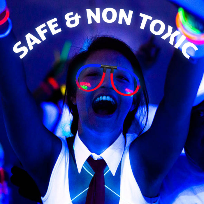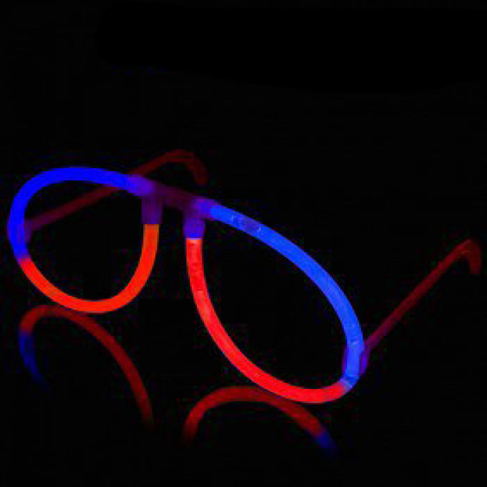 Stand out at any nighttime event with our Glow Red & Blue Bi-Color Aviator Style Eyeglasses – a bold and unique twist on classic glow glasses. Featuring a striking red and blue bi-color design, these glow eyeglasses are perfect for patriotic celebrations, themed parties, festivals, concerts, and night runs. Each set includes 100 glow sticks, 50 aviator-style eyeglass connectors, and 100 bracelet connectors, making it easy to mix and match or offer as party favors. These glowing glasses are non-toxic, safe, and provide a bright glow that lasts for over 10 hours. Just bend, shake, and shine all night long!