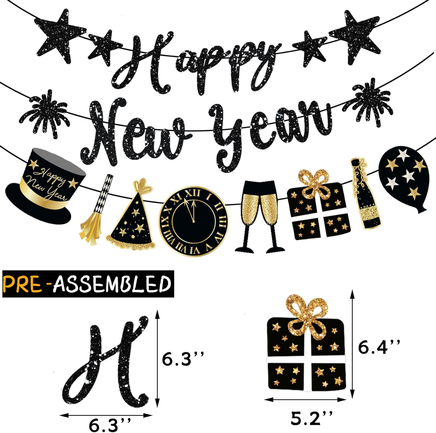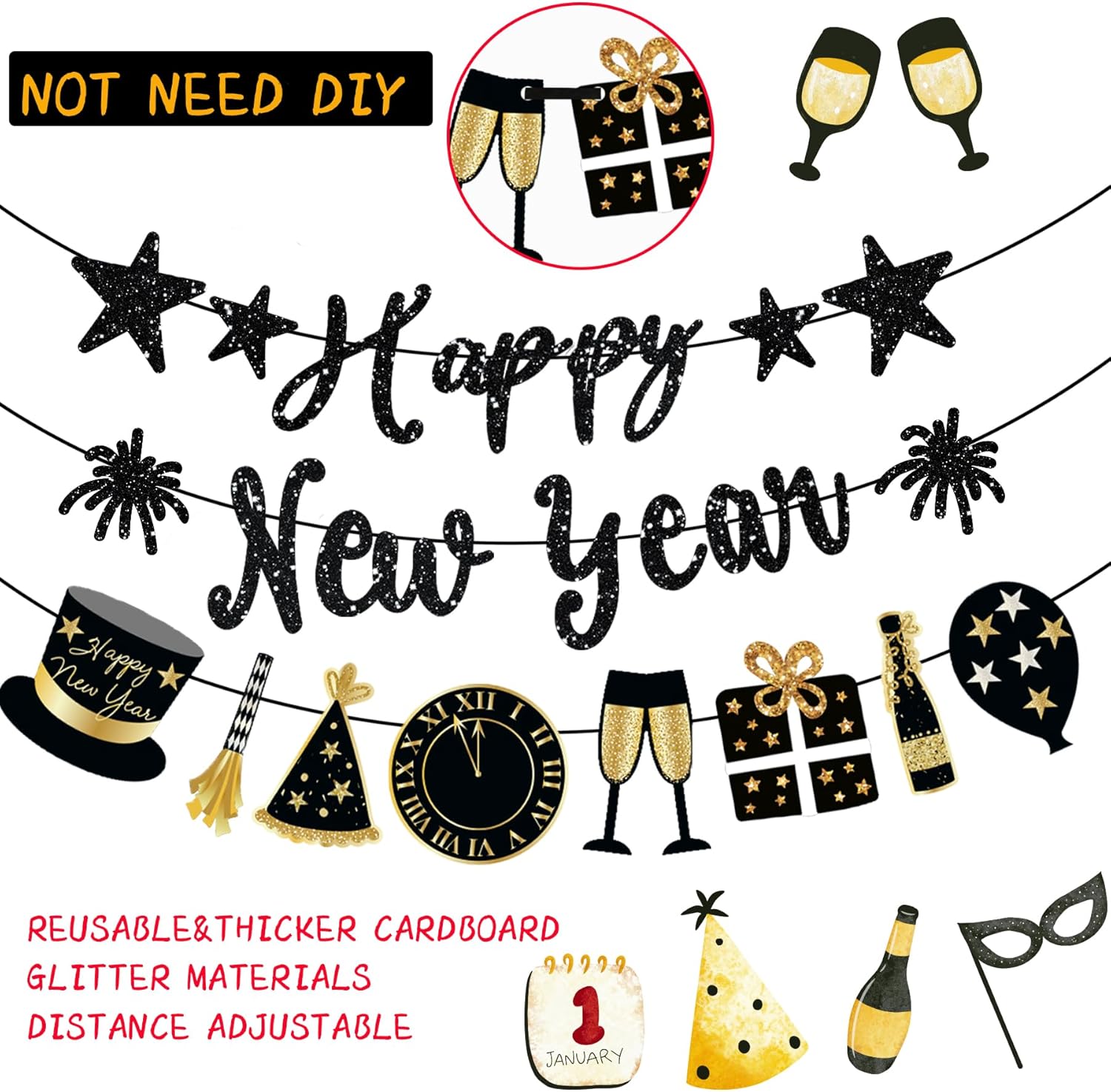 PRE-ASSEMBLED: the Happy New Year banner is only need your a few minutes to find a place to hang,No DIY Required. Happy New Year banner black is very easy to fold too
