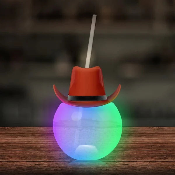 Turn every party into a wild western celebration with this LED Brown Cowboy Hat Ball Cup with Straw. This novelty drinkware combines fun and functionality, making it the perfect addition to themed parties, bachelorette nights, rodeos, festivals, and more. Shaped like a classic cowboy hat and equipped with bright LED lights, this reusable cup lights up your drink and steals the spotlight at any event. Whether you're sipping soda or cocktails, this light up cowboy cup adds southern charm to every sip.