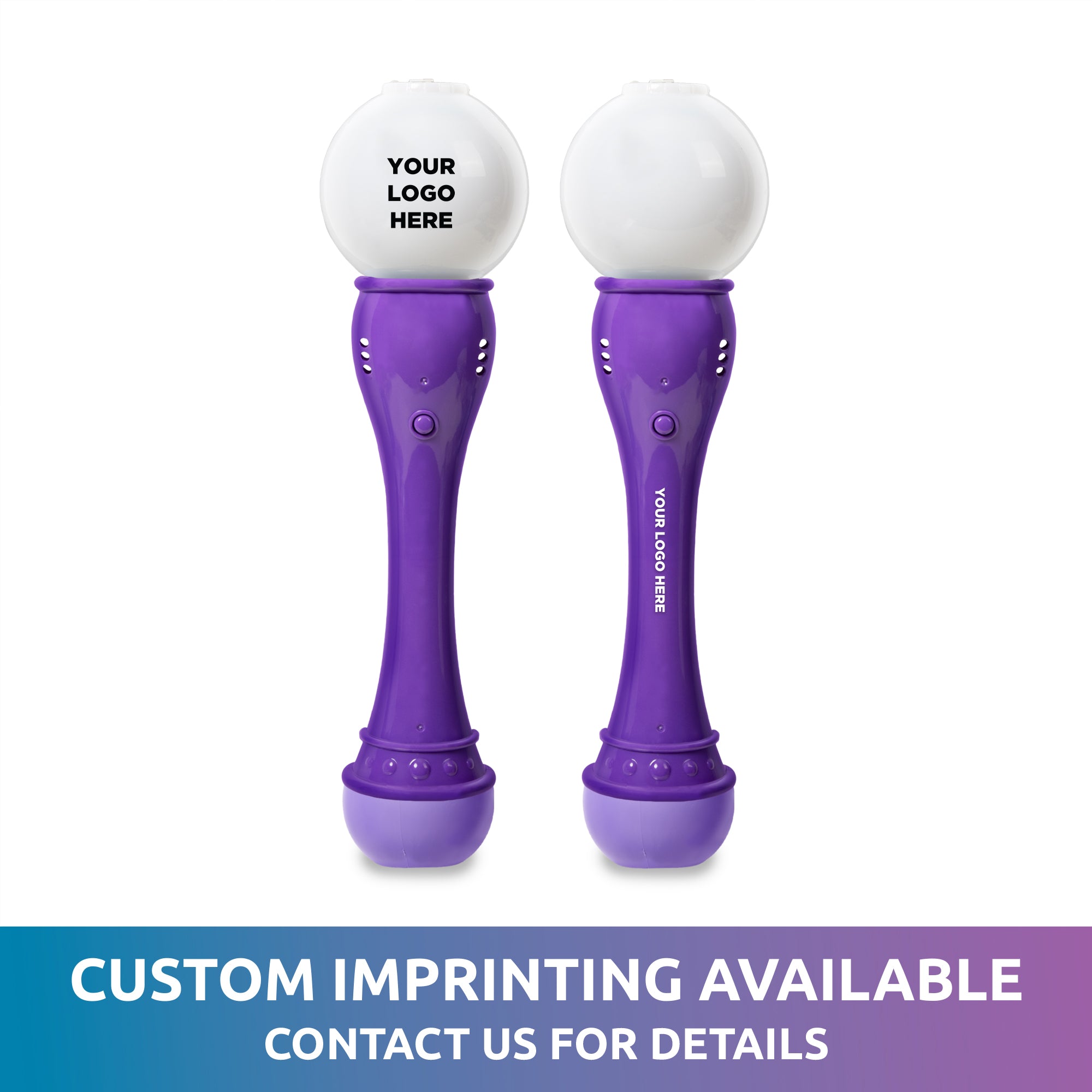 Our LED Purple Bubble Wand is the perfect alternative to bubble guns! With the push of a button, the top of the bubble wand flashes and morphs from green to blue to red as bubbles come out. Each 11" bubble wand comes with a bonus 2" mini bubble wand, and 3 oz. bottle of refillable bubble solution. Once fully assembled, this LED bubble wand measures 13" tall. There are 3 replaceable AA batteries included and installed. Each Light Up Purple Bubble Wand comes in a retail-ready package for easy vending at any outdoor event and a perfect redemption prize. Please carefully read all instructions on the back of the packaging before use. Please call to inquire about customizing a message or logo for a memorable giveaway item.