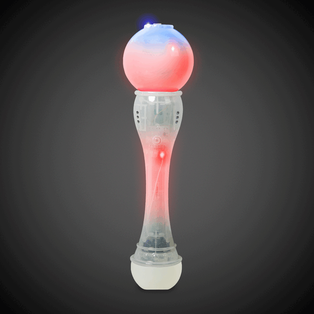 Our LED Translucent Bubble Wand is the perfect alternative to bubble guns! With the push of a button, the entire bubble wand flashes and morphs from green to blue to red as bubbles come out of the top. Each toy features an 11" glittery bubble wand and a 3 oz. bottle of refillable bubble solution. Once fully assembled, this LED bubble wand measures 13"H, and (3) replaceable AA batteries are included & installed. Please carefully read all instructions on the back of the packaging before use, and call to inquire about customizing with a message or logo of your choice.