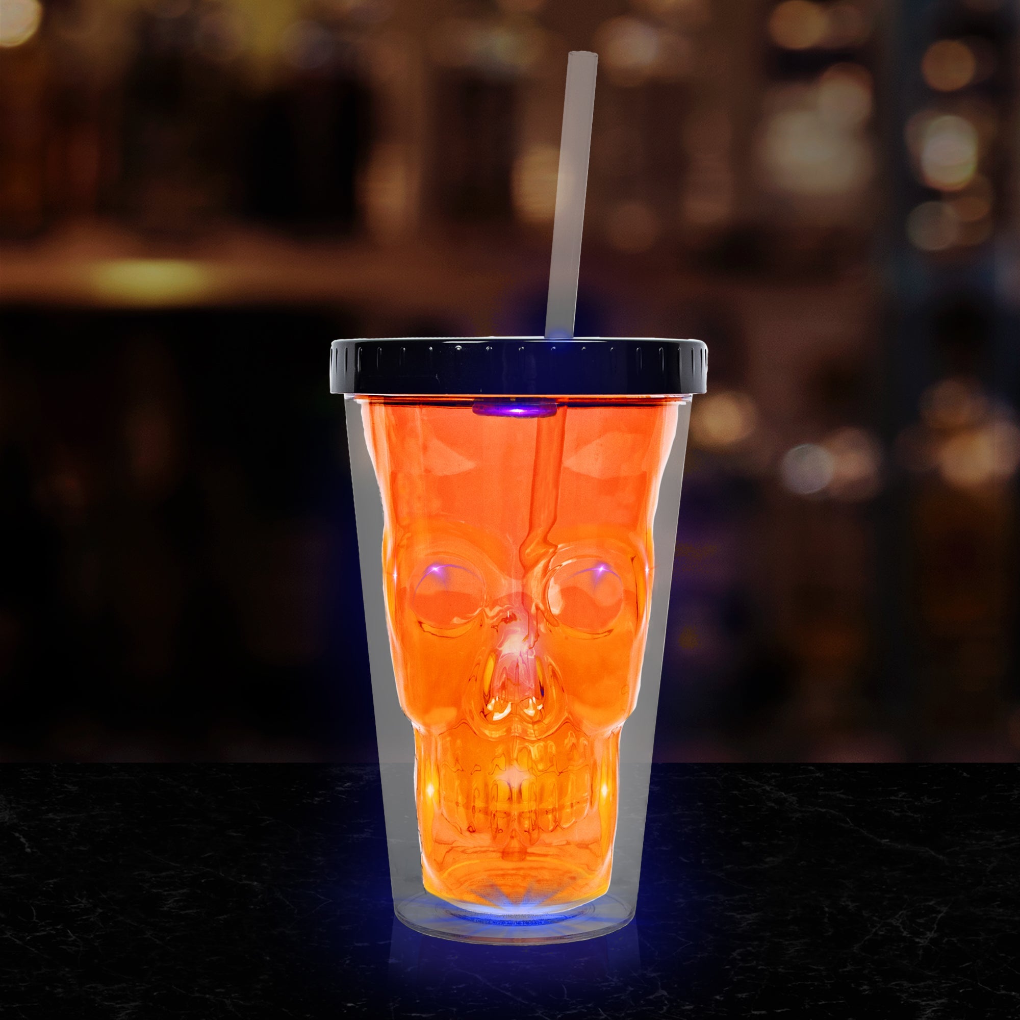 Light up your spooky celebrations with our LED Neon Orange Skull Cup — the perfect glowing drinkware for Halloween, Day of the Dead, pirate parties, and eerie night events. This 16 oz double-wall orange plastic cup features a haunting skull design and a bright blue LED built into the black screw-on lid, creating an eye-catching top-down glow. Complete with a reusable straw and batteries included, it's a fun, reusable accessory for creepy cocktails and festive drinks alike.