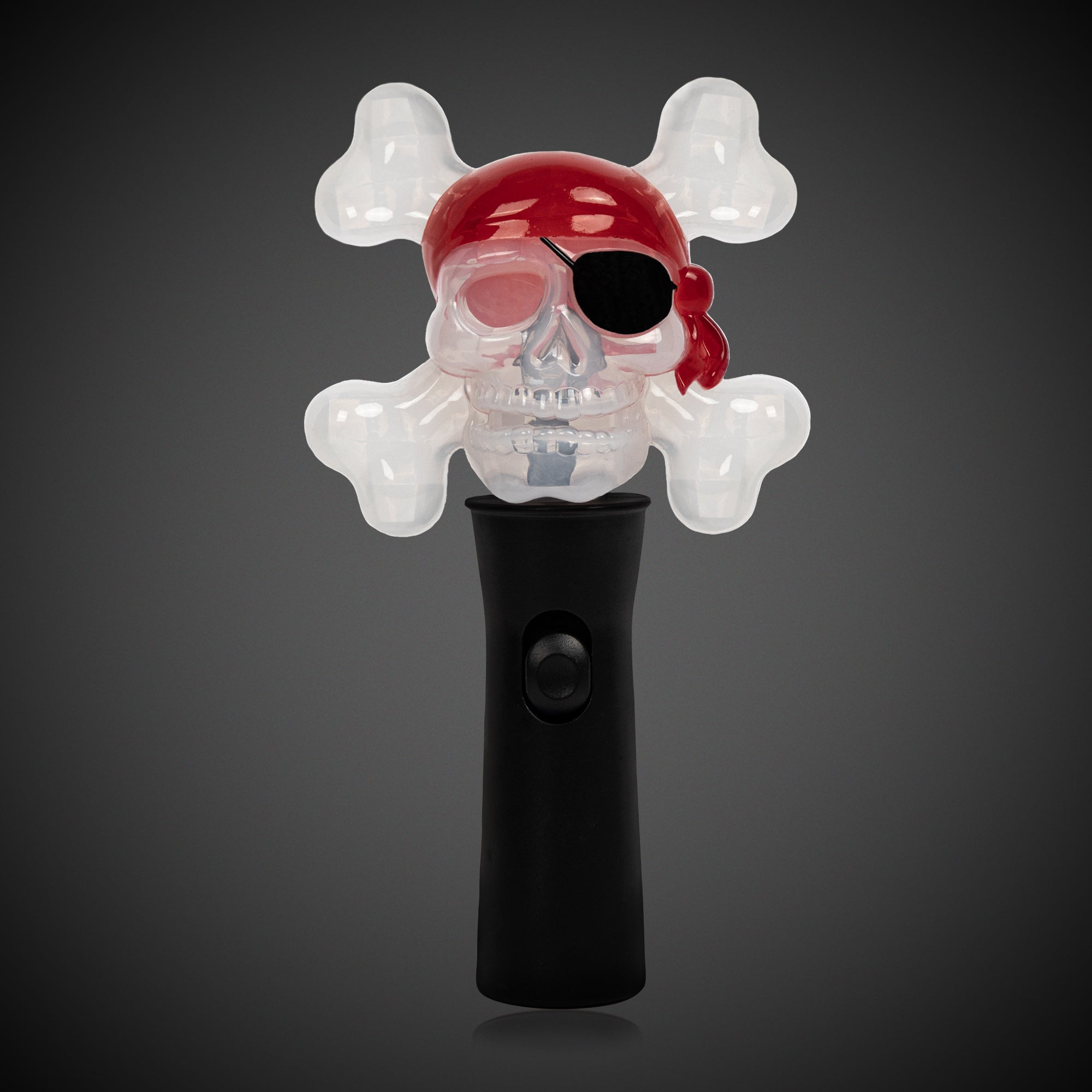 Bring your pirate-themed party to life with our LED Pirate Skull Spinner Wand — the ultimate light-up accessory for little buccaneers and Halloween adventurers! This 7" plastic wand features a fearsome skull and crossbones design with a red headscarf and classic black eye patch. With a simple push of a button, the wand lights up and spins, creating a colorful LED light show that kids and adults will love. Perfect for pirate parties, trick-or-treating, costume accessories, or party favors, this vibrant spinner wand is both fun and safe. Comes with (3) AAA batteries included and installed. Sold individually.