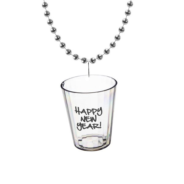Ring in the new year with style—and shots. Our new year shot glass necklace is the ultimate party accessory for countdown celebrations and midnight toasts. Featuring a reusable clear plastic 2 oz. shot glass medallion attached to a classic 33" beaded necklace, this hands-free party must-have lets you keep your drink close all night long. Just wear it around your neck, fill it up, and celebrate without ever losing your shot glass! Made from durable, washable acrylic, it's an eco-friendly alternative to disposable cups—perfect for New Year’s Eve, bar crawls, and party favors.