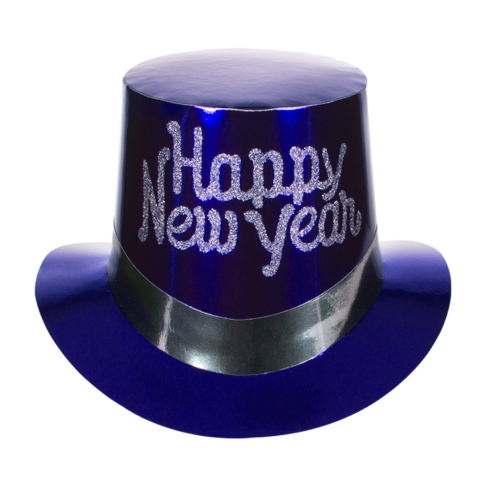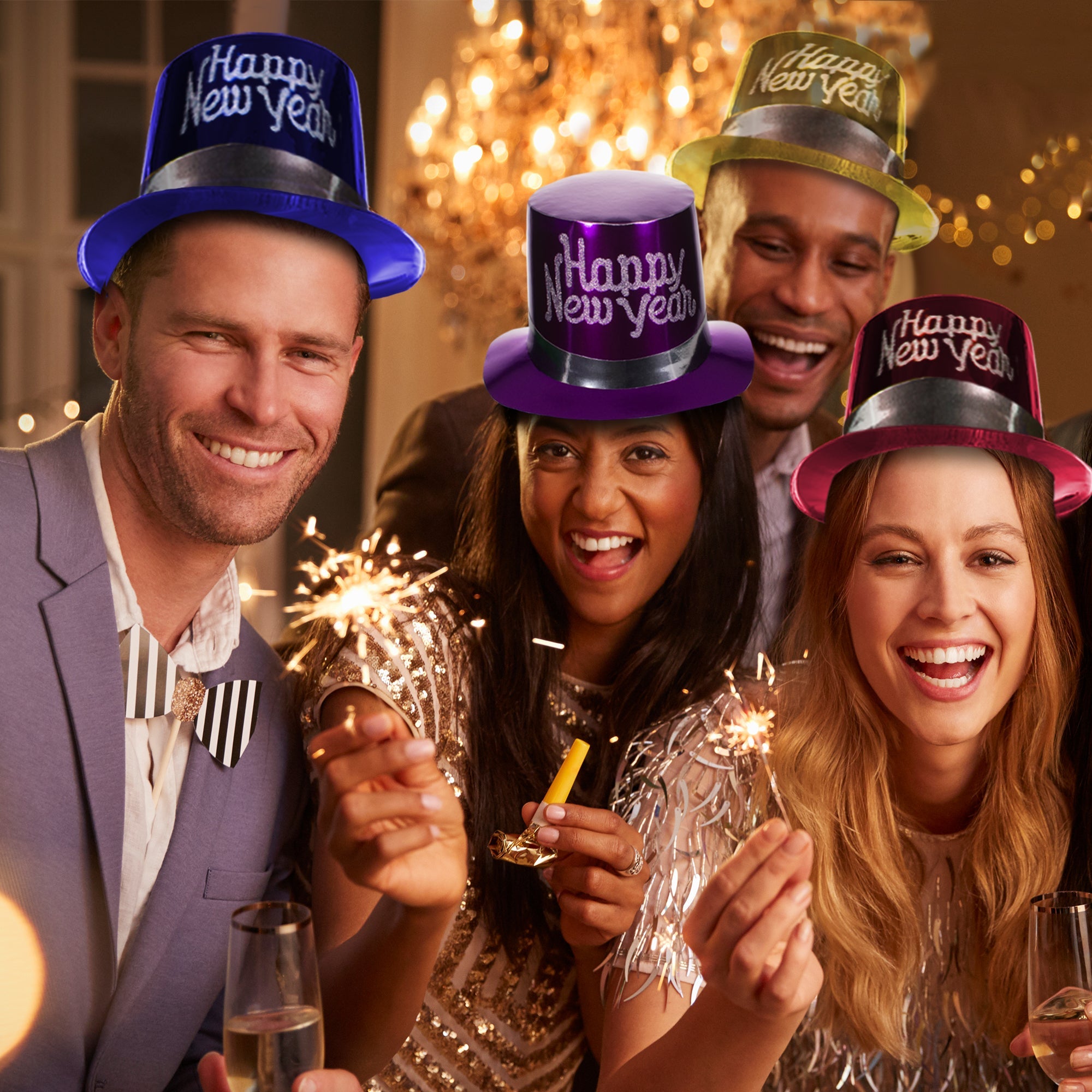 Get your guests ready for the new year with our bright and colorful New Year's Metallic Top Hats. Coming in packs of 36, our metallic red, green, blue, purple, pink, and gold hats are highlighted by silver bands and Happy New Year in silver glitter. These hats are one-size-fits-most and are sold in a pack of 36 assorted color hats.