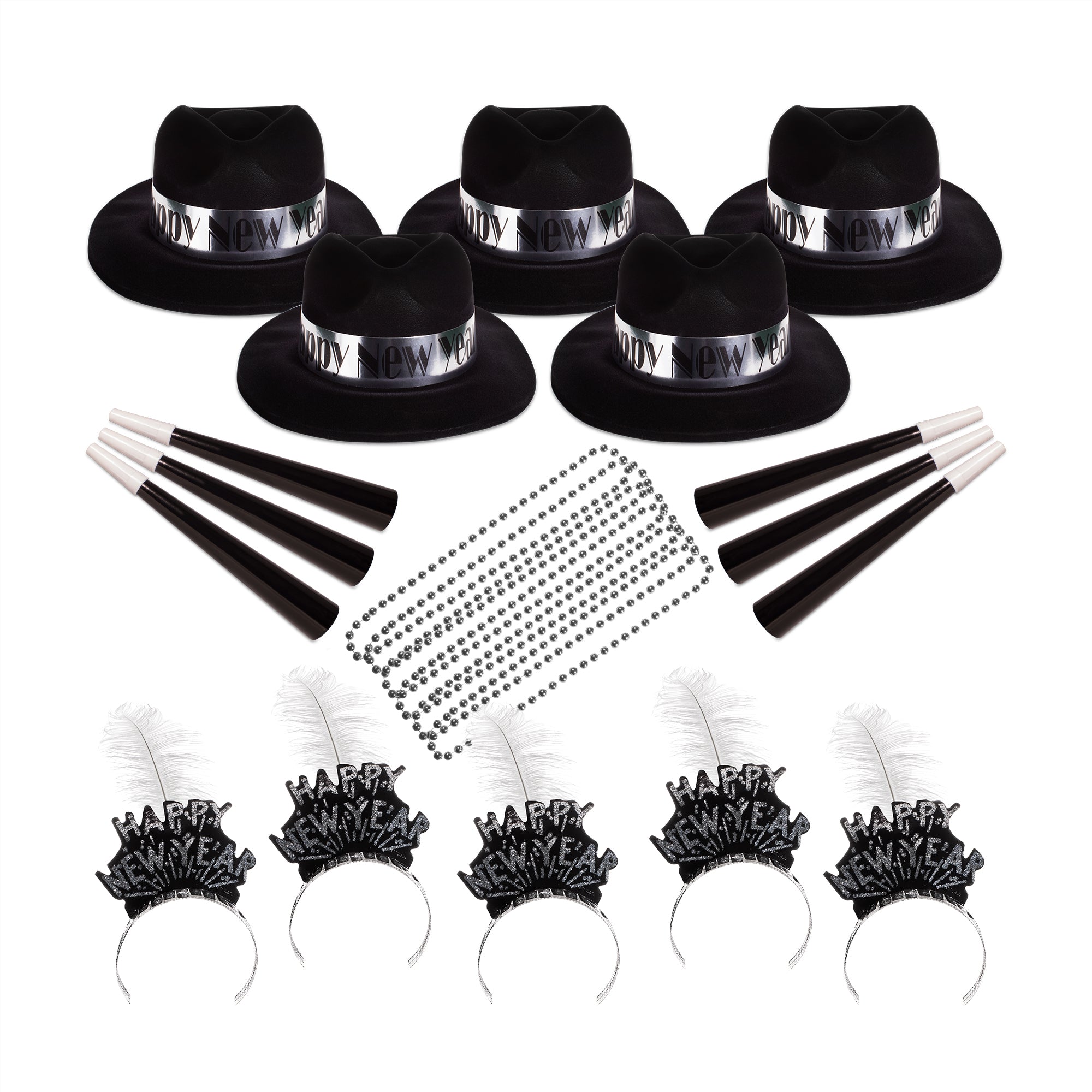 Transform your New Year's Eve bash into a glittering Art Deco extravaganza with this fabulous Silver Midnight party kit designed for 50 guests. Packed with plush gangster hats, shimmering feathered tiaras, festive horns, and cascading silver bead necklaces, everyone gets decked out in vintage glamour. Perfect for creating those Instagram-worthy moments and getting the whole crowd in the celebratory spirit. One size fits most adults, so you can focus on the fun instead of the fuss. Sold by the individual kit. Please order in increments of 1 kit.