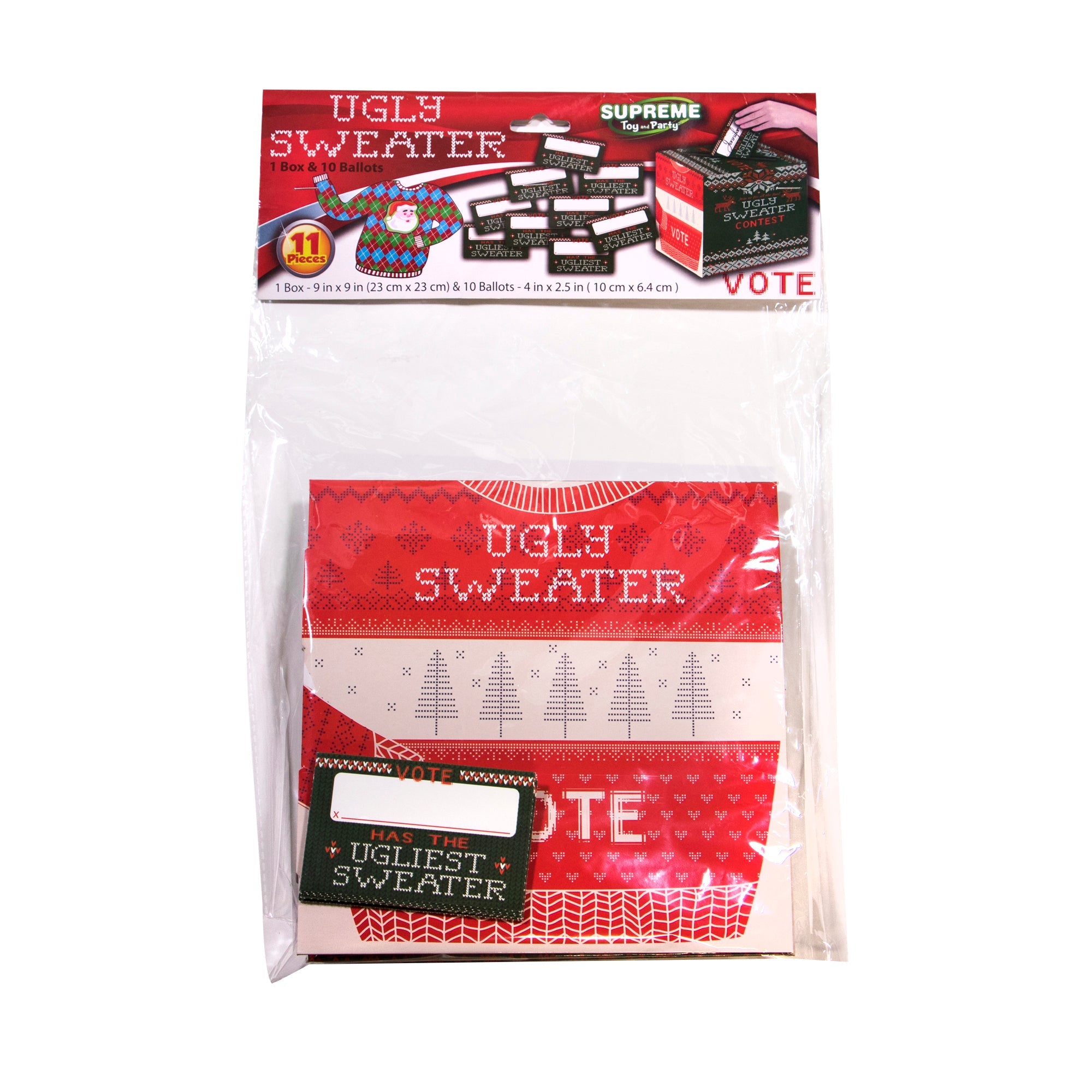 Host the ultimate holiday contest with our Christmas Ugly Sweater Ballot Box! This fun and festive box makes it easy to vote for the best (or worst!) holiday sweater at your party. Perfect for office gatherings, classroom celebrations, or family events, it adds excitement and laughter to your festivities. Each set includes one ballot box and 10 voting cards, which can be copied for larger parties. Coordinate it with our full line of Ugly Sweater decorations and party supplies for a complete themed experience.