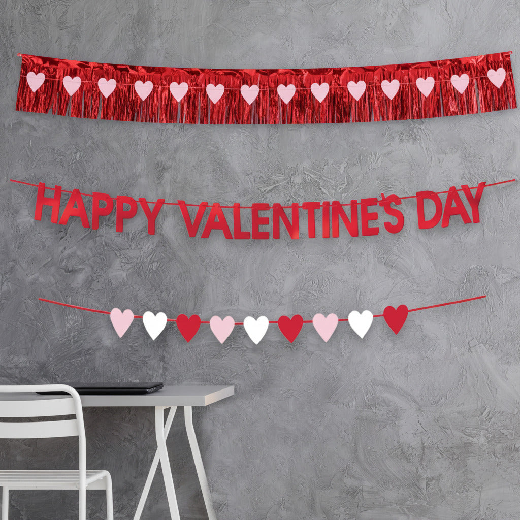 Perfect for Bars, Restaurants, home, office or school, our Valentine's Day Banner Kit is a great addition to your Valentine's Day Decorations. Each kit includes: Foil letter Banner- 6' x 3/8" Paper Heart Banner- 6' x3 1/2", Plastic Heart Banner - 6'x 2 1/2" and a Foil Fringe Banner 6' x 8" . Sold in a pack of 4 decorations. Please order in increments of 1 pack.