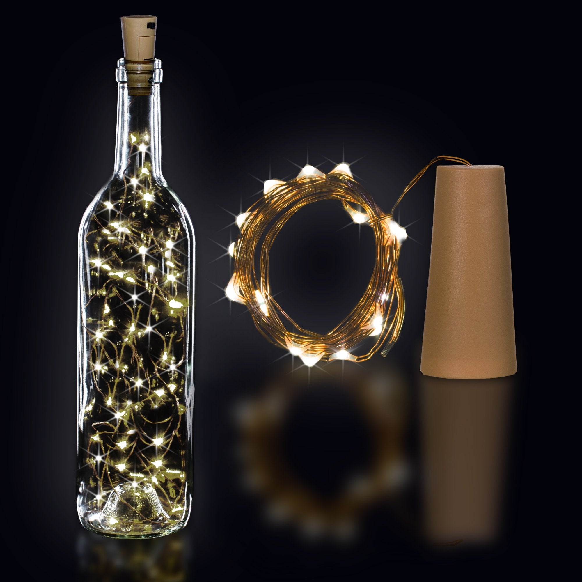 Light bottles for a dramatic white look on a bar or use our 6' long LED wire light set to light glass vases, centerpieces, for table and room decorations, as napkin rings, and more to create a unique light-up shabby chic decoration. Our White Cork String Light Set comes with a plastic cork-type top that holds the on/off switch. Each 6' LED string light comes in a pack of 1 and there are 20 lights on each wire They have only one setting and are steady on only. Each Light Set comes with 3 AG13 batteries included, installed, and can be replaced. Use your imagination for a great light-up look for nighttime fun. Note: BOTTLE NOT INCLUDED.